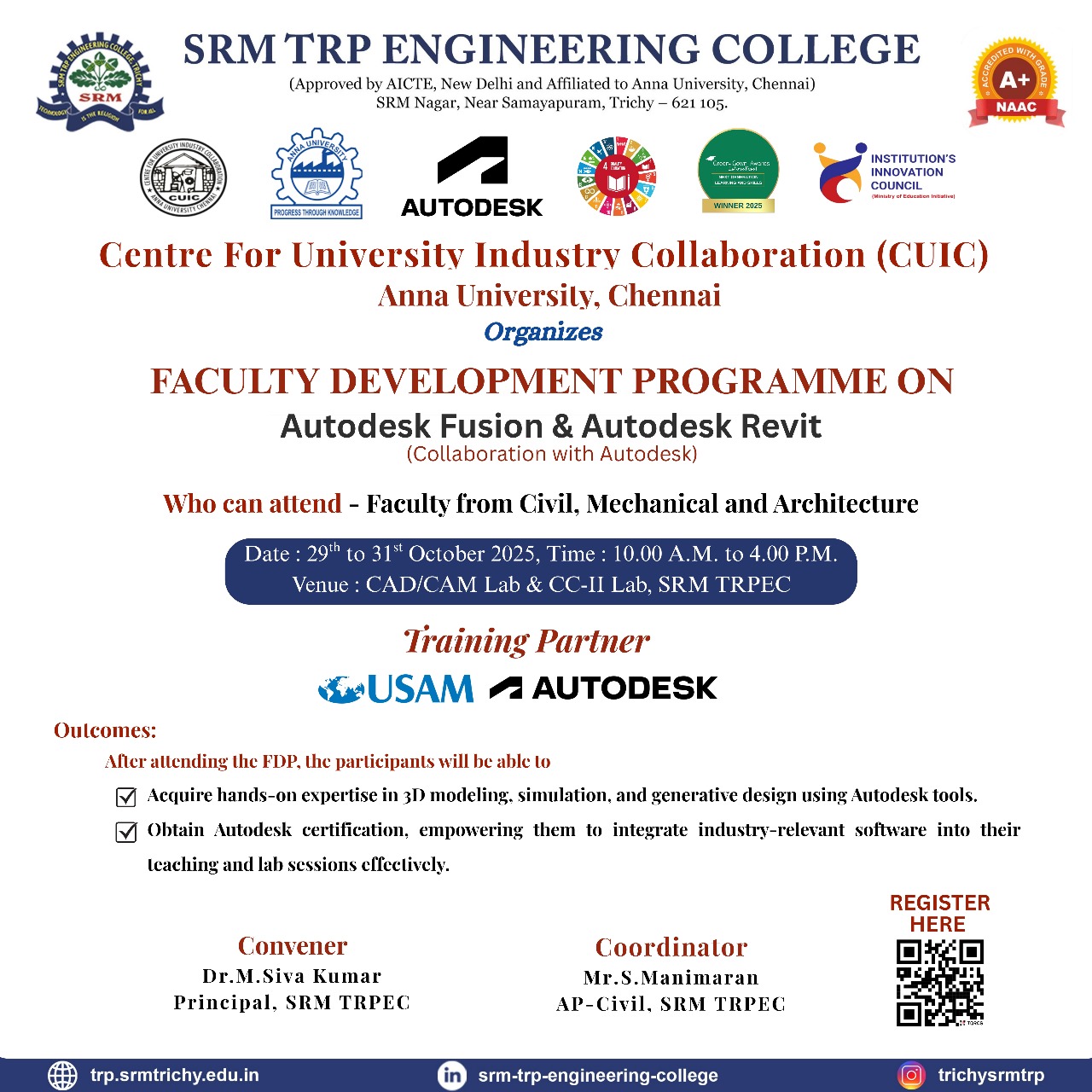 We are delighted to announce a Faculty Development Programme on Autodesk Fusion & Autodesk Revit, organized by the Centre for University Industry Collaboration (CUIC), Anna University, Chennai, in collaboration with Autodesk and USAM Technologies.