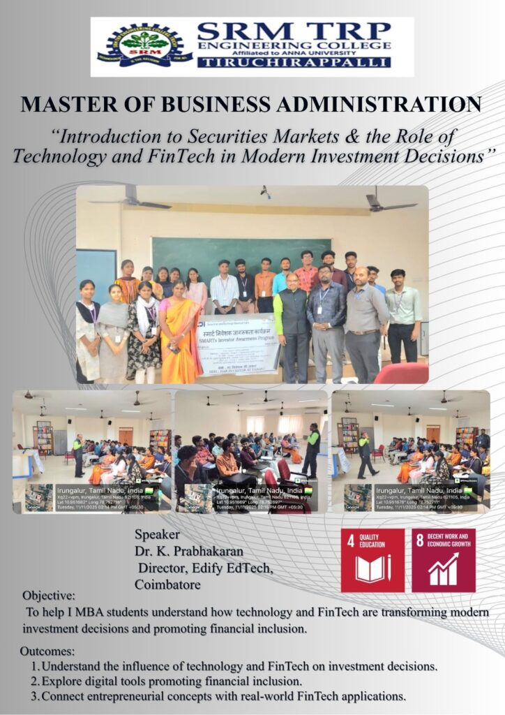 We were delighted to host Dr. K. Prabhakaran, Director of Edify EdTech, Coimbatore, as the resource person for the seminar on “Introduction to Securities Markets” and “The Role of Technology and FinTech in Modern Investment Decisions.”
