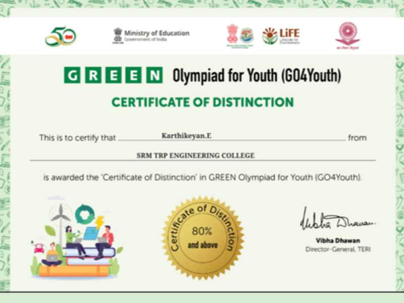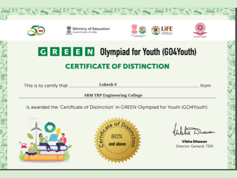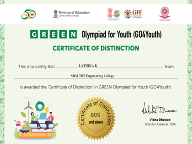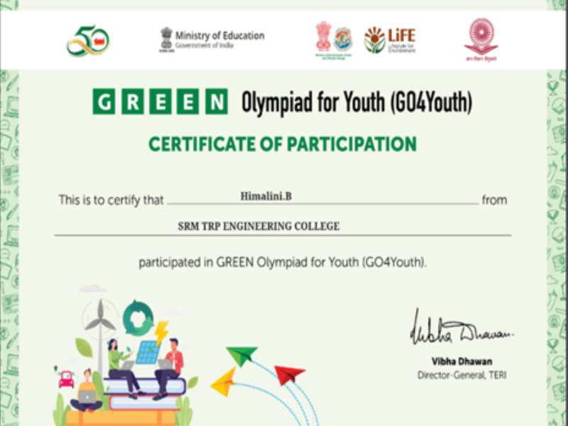 Students from SRM TRP Engineering College excelled in the Green Olympiad for Youth (Go4youth) competition, an interdisciplinary program promoting environmental consciousness. The competition enhances awareness of science, technology, policy, economics, and social aspects of the environment, focusing on energy, environment, and sustainable development. It also boosts understanding of Mission LiFE and other national schemes. Their achievements highlight their dedication to sustainability, bringing pride to the institution and inspiring peers.