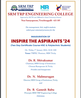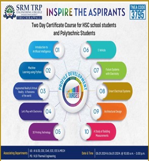 SRM TRP Engineering College organized a two-day “Inspire the Aspirants” certificate course on the Sustainable Development Goals (SDGs) for higher secondary and polytechnic students. The program aimed to educate and inspire young minds about the importance of the SDGs, particularly focusing on Goal 4: Quality Education and Goal 17: Partnerships for the Goals. Through interactive sessions and activities, students were empowered to contribute to a sustainable future.