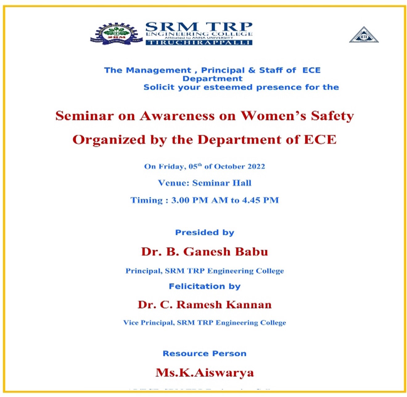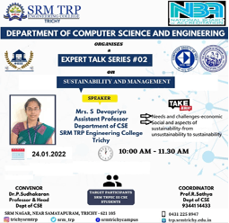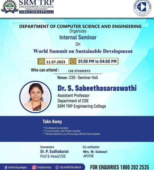 The Department of Computer Science and Engineering at SRM TRP Engineering College organized a seminar titled “World Summit on Sustainable Development.” The event focused on advancing the Sustainable Development Goals (SDGs), particularly SDG 4: Quality Education, SDG 9: Industry, Innovation, and Infrastructure, and SDG 17: Partnerships for the Goals. Experts discussed innovative solutions and collaborative efforts to promote sustainable development, inspiring students and faculty to integrate sustainability into their academic and professional pursuits.