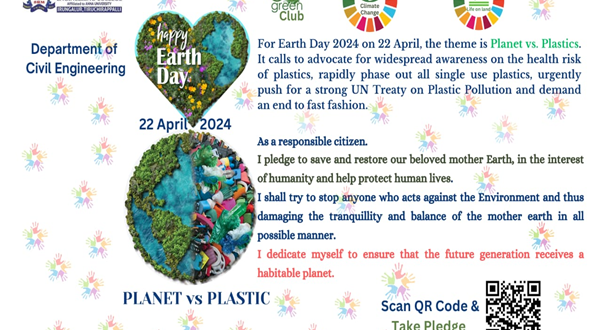 SRM TRP Engineering College’s Department of Civil Engineering and Go Green Club organized “Earth Day 2024” under the theme “Planet vs Plastic.” Participants took a pledge to reduce plastic use and promote sustainable practices, aligning with SDG 12 (Responsible Consumption and Production). The event included tree planting activities and educational sessions on the environmental impact of plastics, emphasizing the importance of sustainable living for a healthier planet.