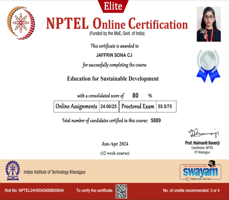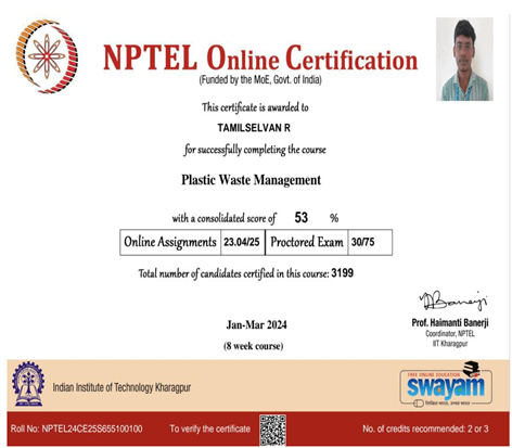 Faculty and students at SRM TRP Engineering College have actively participated in NPTEL courses related to the Sustainable Development Goals (SDGs). These courses cover various aspects of sustainability, including quality education, clean energy, and waste management. Their involvement aims to enhance knowledge and skills to contribute to global sustainability efforts.