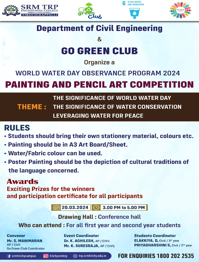 SRM TRP Engineering College’s Department of Civil Engineering and Go Green Club organized the “World Water Day Observance Program 2024,” featuring a painting and pencil art competition. This event aimed to raise awareness about water conservation and sustainable management, aligning with SDG 6 (Clean Water and Sanitation). Participants showcased their creativity to highlight the importance of preserving water resources for future generations.